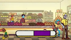 The Big Con is an adventure game where the player controls Ali, a teenager who has to raise money to save her mother's video rental store.[1] In each location, the player has to steal a certain amount of money.[2] Once the threshold is reached, they can continue to explore, or leave the area by talking to Ted.[2] Ali can earn money by pickpocketing non-player characters (NPCs).[2] Each NPC has an indicator that shows the amount of the cash that they hold.[2] To successfully pickpocket a character, the player will have to play a minigame where they must stop a needle in a target area.[2] If Ali fails to pickpocket a NPC, she will have to find another disguise before attempting to pickpocket them again.[2] If she fails three separate times, she will have to rewind VHS tapes at a video rental store.[2] Ali will earn back lost money after completing this task.[2] Ali can also earn money by collecting items and selling them to a pawnbroker.[2] Ali can additionally accept sidequests from NPCs.[2]