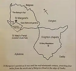 The second estate, known as the Knighton Chapelry, consisted of 1,520 acres situated between the parishes of Evington, Oadby, and Ayleston centred on the ancient village of Knighton.[1][5] Today the large housing estates which have now surrounded historic Knighton as well as the neighbourhoods of Clarendon Park, Stoneygate, South Knighton, West Knighton, and parts of Saffron Lane are all situated on this former estate.[5] Together these territories make up most of the suburbs east of the river soar in the modern city with the exception of Ayleston, Belgrave, and Evington. As a result most post Industrial Revolution parishes in Leicester are daughter churches of St Margaret’s with parishes carved out of the Bishops Fee parish.[5]