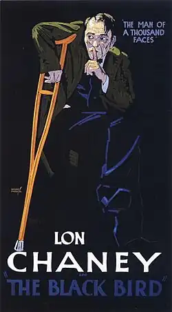 The Blackbird is a 1926 American silent crime film directed by Tod Browning[1] and starring Lon Chaney. The screenplay was written by Waldemar Young, based on a story "The Mockingbird" by Tod Browning (which was originally supposed to be the film's title). Cedric Gibbons and Arnold Gillespie handled the set design. Makeup man Cecil Holland also played one of the old men living at the mission. Character actors Eddie Sturgis and Willie Fung appeared in several other Lon Chaney movies during this time period. The film took 31 days to shoot at a cost of $166,000. The tagline was "Lon Chaney in his successor to The Unholy Three". Stills on the internet shows Chaney in his dual role.[2] In April 2012, the film became available on DVD from the Warner Archive collection.