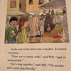 Others claimed that the critics were taking the scene out of context, saying that the language was used to describe the book's villains or that the children were scared of their unfamiliar surroundings.[1][6] The Spectator noted that Biff and Wilf receive a warm welcome in Princess Aisha's kingdom from people also wearing Islamic clothing, arguing that the children "have simply stumbled on a town that isn’t particularly friendly."[8]