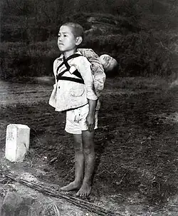 The Boy Standing by the Crematory (alternatively The Standing Boy of Nagasaki) is a historic photograph taken in Nagasaki, Japan, in October of 1945, shortly after the atomic bombing of that city on August 9, 1945. The photograph is of a boy of about 10 with his dead baby brother strapped to his back, waiting for his turn at the crematorium.