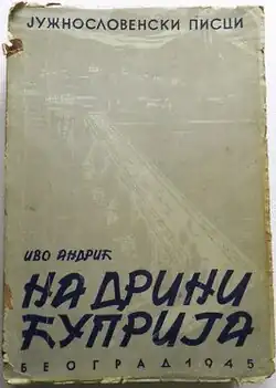 The Bridge on the Drina was written between July 1942 and December 1943.[18][c] A fifty-page outline of the novel has been preserved, as have Andrić's research notes.[18] In March 1945, it became the first title released by the newly founded state-owned publishing house Prosveta, as part of a series entitled Južnoslovenski pisci (South Slav Writers).[19] The first edition, numbering some 5,000 copies, was sold out by the end of that year.[20] It was one of three novels that Andrić published in 1945, the others being Travnik Chronicle (Serbo-Croatian: Travnička hronika) and The Lady from Sarajevo (Serbo-Croatian: Gospođica), in September and November 1945, respectively.[14] A total of five editions of The Bridge on the Drina were published over the next four years.[20] Andrić's works attained international recognition only after he was awarded the Nobel Prize, and were translated into dozens of languages thereafter.[21] The novel had been translated into English two years earlier by Lovett F. Edwards, in 1959.[22]