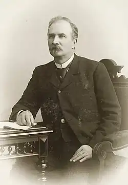 From the 1870s to the 1890s, the politics of Finland featured a struggle between the Svecomans and the Fennomans. Whereas the former sought to preserve the privileged position of the Swedish language, the latter desired to promote Finnish as a means of inventing a distinctive national identity.[3][4] High on the "agenda" for the Fennomans was to develop vernacular opera, which they "understood as a symbol of a proper nation"; to do so, they would need a permanent company with an opera house and a Finnish-language repertoire at its disposal.[5] Swedish-speaking Helsinki already had a permanent theatre company housed at the Swedish Theatre, and thanks to Fredrik Pacius, two notable, Swedish-language operas: King Charles's Hunt (Kung Karls jakt, 1852) and The Princess of Cyprus (Princessan af Cypern, 1860).[6][7][d] Success was hard-won: in 1872, the Fennoman Kaarlo Bergbom founded the Finnish Theatre Company, and a year later it named its singing branch the Finnish Opera Company. This was a small group that, without an opera house as residence, toured the country performing "the best of the foreign repertoire", albeit translated into Finnish. However, the Fennomans still remained without an opera written to a Finnish libretto, and in 1879 the Finnish Opera Company folded due to financial difficulties.[9]