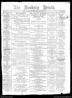 ![]() Front page of the first issue of The Bunbury Herald, 1892 | |