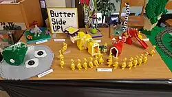 The Yooks and the Zooks are two factions of anthropomorphic birds living on opposite sides of a long curving wall. The Yooks wear blue clothes; the Zooks wear orange. The primary dispute between the two cultures is that the Yooks eat their bread with the butter-side up, while the Zooks eat their bread with the butter-side down. The conflict between the two sides leads to an escalating arms race, which results in the threat of mutual assured destruction.