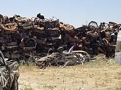 Next to the wall of burnt cars, there are hundreds of other cars that are no longer usable due to the attack, and they too are displayed as a memorial to the massacres committed against their owners.[4][5]