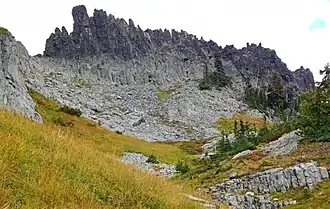 The Castle is a summit in Lewis County of Washington state.[3] It is part of the Tatoosh Range which is a sub-range of the Cascade Range. The Castle is located in Mount Rainier National Park, and it is 0.2 mile immediately east of Pinnacle Peak. Precipitation runoff from The Castle drains into tributaries of the Cowlitz River.[1]