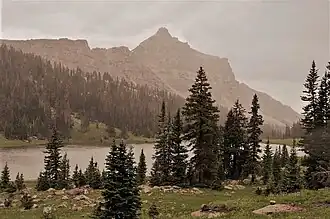 The Cathedral is set within the High Uintas Wilderness on land managed by Uinta-Wasatch-Cache National Forest. It is situated in the Uinta Mountains which are a subset of the Rocky Mountains, and it ranks as the 87th-highest summit in Utah.[2] Topographic relief is significant as the summit rises 2,000 feet (610 meters) in one mile. Neighbors include Ostler Peak 3.7 miles to the southwest, Mount Beulah two miles northeast, Yard Peak 1.6 mile to the south, and Dead Horse Peak is 2.4 miles to the south-southeast. Precipitation runoff from this mountain drains north to the East Fork Bear River. This mountain's toponym has been officially adopted by the United States Board on Geographic Names.