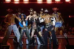For the first act, which was based on 1980s New York, Fındıkoğlu came up with a "punky" tailcoat, inspired on one Madonna had worn during a performance in Japan; "it was a men’s coat that she got from a vintage store [...] [For the new one], we tricked it out, and added memorabilia and pins from the ’80s onto it", explained Yohannes.[54] A boxing theme was used on the wardrobe of the 1990s-inspired second act.[54] Madonna donned a red silk slip dress with black lace details underneath a boxing robe, along with a pair of knee-length, lace-up heeled boots.[55] Wanting to explore the sexual liberation of songs like "Erotica", Yohannes and Melssen settled on a boxing theme.[54] Gaultier created the outfit for the performance of "Vogue" (1990): a black conical mini dress, encrusted with black crystals, that echoes the one Madonna wore on the Blond Ambition World Tour of 1990.[54][56] A model of green, yellow, and blue tones was created specifically for the Rio de Janeiro show.[57] The third act was based on the 2000s, and included songs like "Die Another Day" and "Don't Tell Me" (2000). Ruslan Baginskiy came up with an ensemble consisting of custom Miu Miu steel-toed cowboy boots, a leather corset, a studded shirt, and a leather cowboy hat.[54][55]