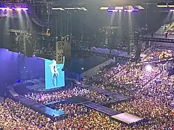 According to James, the show revolves around four main themes: Time, New York City, fragments, and "the story of [Madonna]". Drawing on these elements, as well as the singer's 40-year long career, the stage was conceived as an abstract map of New York, with a network of B-stages and runways inspired by the streets and blocks of Manhattan —Uptown, Downtown, Midtown, East and West. The team also came up with a kinetic, revolving, three-layered circular central stage that refers to both the wedding cake from Madonna's performance of "Like a Virgin" at the 1984 MTV Video Music Awards and a clock's shape.[36] Also present was a floating, illuminated portal frame that lifted Madonna 9 m (30 ft) off the ground, and moved at 4.5 m (15 ft) per second.[37] It allowed the singer to fly over the audience and move between the stage.[36][38] According to Lipson, the portal was meant to act like a "time machine".[36] "Live to Tell" (1986) was one of the numbers that saw Madonna riding the flying portal.[36][38]