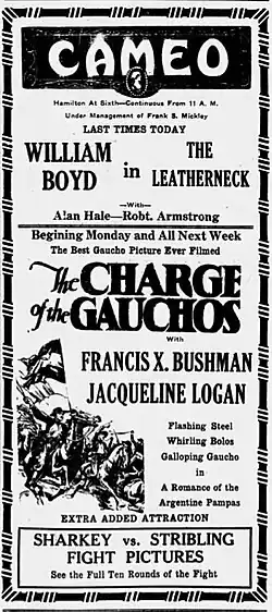 The Charge of the Gauchos (Argentine title: Una nueva y gloriosa nación) is a 1928 American-Argentine silent historical film directed by Albert H. Kelley and starring Francis X. Bushman, Jacqueline Logan, and Guido Trento. Bushman plays Manuel Belgrano, one of the leaders of the 1810 May Revolution. The film's Spanish title refers to a line from the Argentine national anthem. It was made as a patriotic endeavor designed to boost the small Argentine film industry, but with enough action and romance to appeal to international audiences particularly in the UK and the United States. The film was also released under the title The Beautiful Spy.[1]