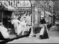 Special effects used in the film include pyrotechnics, artificial snow, superimpositions, and dissolves.[3] The film is also notable for including a cross-section set, allowing Méliès to show both the inside and the outside of the bakery; other Méliès films featuring cross-section scenery include The Impossible Voyage, A Roadside Inn, The Chimney Sweep, and Tunnelling the English Channel.[4] Another scenic effect occurs when the rag-and-bone man comes across the beggar girl; when he turns on his lantern to get a better look at her, a simulated stream of light, painted in white on the scenery, is added using a substitution splice.[5]
