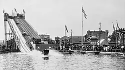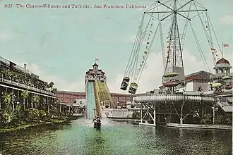 In 1894, Paul Boyton conceived of the "Paul Boyton's Water Chutes" amusement ride in Chicago. Boyton began licensing the concept, and the attraction caught the attention of San Francisco.[1] In 1895, the "Shoot the Chutes" opened to the public on Haight Street, a few blocks east of Golden Gate Park.[2] Visitors boarded the boats stationed atop a tall structure, the ride included a 300-foot long descent down to a pool situated below.[3] On March 16, 1902, the Haight Street Chutes closed.[4] Following the closure of the Haight Street Chutes, the amusement moved to Fulton Street in the Inner Richmond District,[5] opening in May.[6] In 1909 the Fulton Chutes were closed, the property was sold to a developer.[7] Irving Ackerman, the son of the original owner relocated the operation to Fillmore Street.[8][7][9][10]