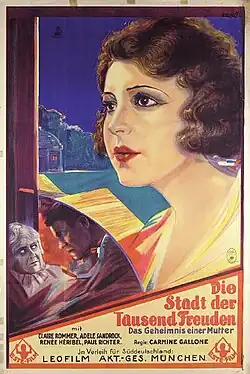 The City of a Thousand Delights (German: Die Stadt der tausend Freuden) is a 1927 German silent drama film directed by Carmine Gallone and starring Paul Richter, Adele Sandrock and Langhorn Burton.[1] It is based on the 1907 novel The City of Pleasure by the British writer Arnold Bennett. The film's sets were designed by the art directors Otto Erdmann and Hans Sohnle.