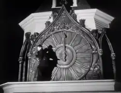 Between 4 p.m. and 5 p.m., transportation becomes important as characters travel on planes, trains and automobiles.[4] At 6 p.m., characters eat dinner and have shootouts.[9] In the evening, they attend parties.[3] Around 8 p.m., orchestras and theaters begin their shows.[10] As midnight approaches, the characters become more frantic, throwing tantrums and requesting stays of execution. Screeching violins from multiple clips build up to the moment.[4] At midnight, Orson Welles is impaled on a clock tower in The Stranger, and Big Ben, a common sight in The Clock, explodes in V for Vendetta.[4][6]