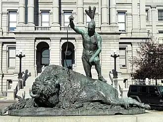 The Closing Era is a bronze sculpture of a Native American hunter standing over a dying bison, installed on the East side of the Colorado State Capitol in Denver.[1][2] The statue was created by Preston Powers, the son of famous sculptor Hiram Powers and "represents the end of the traditional lifestyle of Native Americans in Colorado".[3] It was originally created in 1893 for the World's Columbian Exposition in Chicago and subsequently donated to the state of Colorado and erected on a granite base. The base originated from Cotopaxi in Fremont County, Colorado. Powers commissioned a poem from John Greenleaf Whittier for the base of the statue.[3]