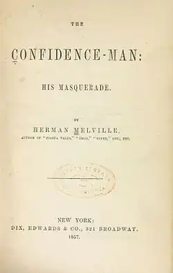 The Confidence-Man: His Masquerade, first published in New York on April Fool's Day 1857, is the ninth and final novel by American writer Herman Melville. The work was published on the exact day of the novel's setting. Centered on the title character, The Confidence-Man portrays a group of steamboat passengers travelling on the Mississippi River toward New Orleans. The narrative follows a succession of confidence men who, as suggested by the book's title, may be the same man in disguise. The confidence man uses various methods of persuasion to sell patent medicine, encourage speculation in fraudulent business, donate to non-existent charities, and other cons. In the latter part of the narrative, the confidence man discusses friendship and other topics with the other passengers. Interspersed with the dialogues are other texts: essay, short story, ode, and others. These additional texts inspire the reader to consider the difference between fiction and reality.