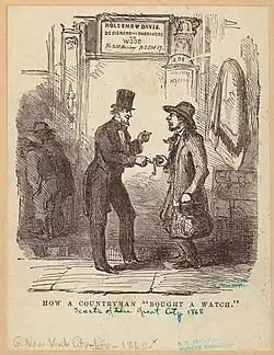 Also in the 1850s, magazines portrayed P. T. Barnum's promotion of hoaxes to make money as a similar kind of swindling.[4] Early in 1855, there was widespread news coverage of a man who tricked people out of their money in New York by pretending to need an emergency loan. The April account in the Albany Evening Journal, where the confidence man pretends to be an acquaintance of a jewelry store employee, and then draws attention to their shared membership in Freemasonry to gain sympathy for a monetary donation, is very similar to Ringman's con in chapter 4 of the novel. Newspaper accounts emphasized the "new" and "original" methods of the confidence man.[5] The account in the New York Herald recounted how baldly the confidence man asked for his victim's confidence, for example, with the question "Are you really disposed to put any confidence in me?" The characters in Melville's novel similarly ask directly if their interlocutors have confidence in them.[6] The land fraud found in the Black Rapids Coal Company and the herb doctor's miracle cures were both types of fraud common in the mid-19th-century.[7]