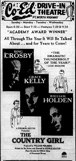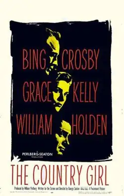 The Country Girl is a 1954 American drama film written and directed by George Seaton and starring Bing Crosby, Grace Kelly, and William Holden. Adapted by Seaton from Clifford Odets's 1950 play of the same name, the film is about an alcoholic has-been actor who is given one last chance to resurrect his career. The film was entered in the 1955 Cannes Film Festival.[2]