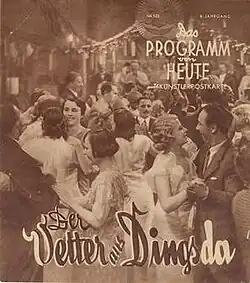 The Cousin from Nowhere (German: Der Vetter aus Dingsda) is a 1934 German operetta film directed by Georg Zoch and starring Lien Deyers, Lizzi Holzschuh and Walter von Lennep. It is based on the 1921 operetta The Cousin from Nowhere composed by Eduard Künneke. It was later turned into a 1953 film of the same title.[1]