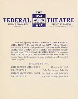 - ^ a b "The Cradle Will Rock (Windsor Theatre)". Playbill. January 3, 1938. Retrieved March 11, 2023.