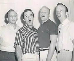 The boys sang on their father's radio shows and made a record with Bing on September 5, 1950,[1] called "A Crosby Christmas" which charted at number 22 in the Billboard lists in December 1950.[2] In 1958, the four brothers decided to form a vocal group called The Crosby Brothers.[3] They were featured on the cover of Life on September 15, 1958. An appearance on The Phil Silvers Show on November 14, 1958, followed, and they made their debut as a singing group at Tucson, Arizona, in 1959. Moving on to the Chez Paree Chicago nightclub in June 1959, they earned a good review from Variety, which said "CROSBY BROS. Chez Paree, Chicago. Songs 58 Mins. Bing Crosby's four sons are launched on the cabaret scene in high style. The frères – Gary, Phillip, Dennis and Lindsay – have a superlative act that is likely to abash those skeptics who surmised the boys would trade merely on the lustrous family name."[4] They continued to perform successfully at locations such as the Sahara in Las Vegas and the El Morocco nightclub in Montreal. However, after one of their performances at El Morocco in December 1959, the boys fought among themselves and Gary Crosby left the group.[5]