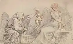 Another of Vien's students, Jacques Louis David, produced a mirror-image drawing of the original fresco whilst in Rome in 1776. Noël Lemire used that drawing as the basis for a copperlate engraving which appeared in Jean Claude Richard de Saint-Non's two-volume 1782 Voyage pittoresque ou description des Royaumes de Naples et de Sicile (A Picturesque Journey or Description of the Kingdoms of Naples and Sicily).[2] In that work the copperplate is entitled The Cupid Seller of Herculaneum, showing that the fresco's actual findsite had already been forgotten. David and Lemire were largely faithful to the original fresco, but the figures are closer to each other, and the seller lasciviously shows her breasts, whilst the sharp contours and dark shadows match contemporary French taste.