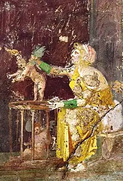 On the right side, under a yellow curtain, a seller is depicted sitting on a small stool and offering her wares. She has taken a small cupid out of the cage and is now holding it by one of its wings, while another is still in the cage waiting to be shown. The two women are obviously looking through the dealer's offerings to decide on one of the small gods, while the winged creatures are impatiently waiting to go to their new mistress. Since the strap of the seller's dress has slipped over her left shoulder, she is thought to be a hetaera.