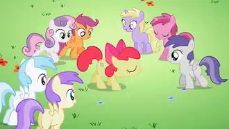 ![]() Apple Bloom (center) shows off her new cutie mark to her classmates. | |