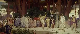 In the Academy exhibition of 1876, with The Daphnephoria, Leighton once more chose a classic theme, for a painting which, by its composition, reminded the critics and lovers of art of the artist's early success with the Cimabue's Madonna, and of his other large processional picture, the Syracusan Bride.[3] The work was painted for Stewart Hodgson. He paid £1,500 for it, and Leighton gave him all the studies he made for it.[4] It was later acquired by Lord Leverhulme, and was transferred from his private collection to the Lady Lever Art Gallery in 1922.