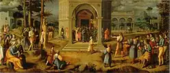 Italian depictions include a small cassone painting of about 1460 (one of a group of three scenes), a Florentine engraving of 1460–80, and in a painted miniature in a luxury illuminated copy of a printed Bible in Italian.[14] The subject takes the full side of a cassone painted by Francesco Bacchiacca of 1523, now in the Gemäldegalerie Alte Meister in Dresden, probably the best known of all depictions.[15]
