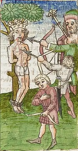 Different moments from the shooting scene are shown. In the anonymous drawing the archers are taking aim, in Mair's print one son has shot and the next is about to, while the youngest son looks away in disgust. Wolfgang Stechow, who first set out the history and depiction of the story, describes the print as the "most subtle and moving interpretation of the story in art, despite its many awkward details".[12] It emphasizes the moral interpretation of the story, and Solomon is absent. In Master MZ's depiction the shooting has finished and the youngest son is about to be crowned. In this the commanding turbaned figure on horseback represents Solomon, as the judge of the contest.[13] It is typical of the obscurity of the subject that this print was called a Martyrdom of Saint Sebastian by the great cataloguer Adam Bartsch.[3]