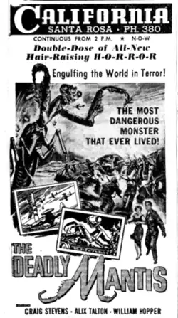 The Deadly Mantis is a 1957 American science fiction monster film produced by William Alland for Universal-International. The film was directed by Nathan Juran from a screenplay by Martin Berkeley based on a story by producer William Alland.[4] The Deadly Mantis stars Craig Stevens, William Hopper, Alix Talton and Pat Conway.[5]