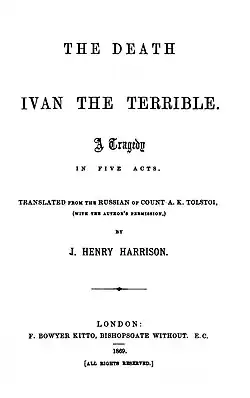 The Death of Ivan the Terrible (Russian: Смерть Иоанна Грозного, romanized: Smertʹ Ioanna Groznovo) is a historical drama by Aleksey Konstantinovich Tolstoy written in 1863 and first published in the January 1866 issue of Otechestvennye zapiski magazine.[1][2] It is the first part of a trilogy that is followed by Tsar Fiodor Ioannovich and concludes with Tsar Boris.[2] All three plays were banned by the censor.[3] It dramatises the story of Ivan IV of Russia and is written in blank verse.[4] Tolstoy was influenced by the work of William Shakespeare in writing the trilogy, which formed the core of his reputation as a writer in the Russia of his day and as a dramatist to this day.[5]