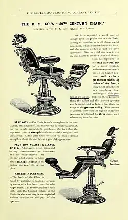 In the 1890s, L Gardner & Sons made dentists' chairs for the company. Over a period of three years, 106 were produced some lifted hydraulically, and others by a rack and pinion system.[3] In 1914, the company was located at Alston House, Newman Street, London, and produced artificial teeth, dental rubbers, dental chairs, vulcanizers' instruments, and dentists' requisites.[4] It also had offices in Manchester, Glasgow, and Dublin.[5]