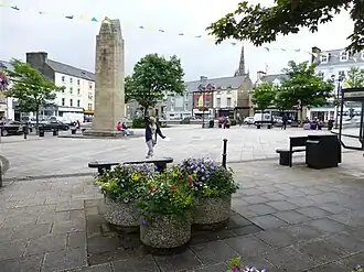 The Diamond is the main square in Donegal Town. It forms the town centre with an extensive pedestrian area with seating and trees. It includes a prominent 'obelisk' unveiled in 1938 celebrating 'the Four Masters', four Gaelic historians led by Brother Mícheál Ó Cléirigh who wrote The Annals of the Four Masters between 1630 and 1636.[1][2] The Plantation of Ulster and the establishment of 'plantation towns' often included a meeting area or market place (often with a 'mercat cross') in the town centre.[3]