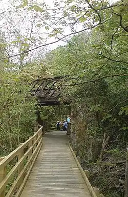 The reserve is 25 acres (10 ha) in area and is bisected by the Afon Cefni (River Cefni). It was formed by glaciers during the last ice age as they eroded the soft rock of the area. It gained its current name in the 1830s[1] and was designated as a local nature reserve in 1995, although there has been a blanket tree preservation order in place since 1971. In 2003 the reserve was granted £122,000 for major improvements including better disabled access, boardwalks and tree sculptures.[2] It was awarded the UK MAB Urban Wildlife Award For Excellence in 2004 thanks to this work.[3] The boardwalks allow visitors to make their way north to Llyn Cefni, travelling parallel to the disused tracks of the Anglesey Central Railway. Red squirrels can be found in the area.