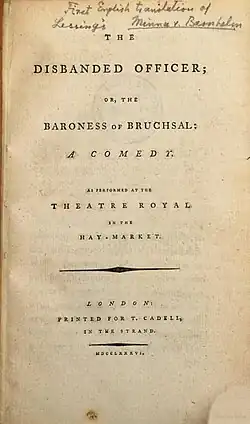 The Disbanded Officer; Or, The Baroness of Bruschal is a 1786 comedy play by James Johnstone, inspired by the 1763 German play Minna von Barnhelm by Gotthold Ephraim Lessing. It premiered at the Theatre Royal, Haymarket in London on 24 July 1786.[1] The original London cast included John Palmer as Colonel Holberg, John Bannister as Paul Warmans, Robert Baddeley as Katzenbuckel, William Parsons as Rohf, Charles Farley as Boy, Elizabeth Farren as Baroness of Bruschal, Mary Bulkley as Lisetta and Elizabeth Inchbald as Lady in Mourning. The Irish premiere took place at the Smock Alley Theatre in Dublin on 15 February 1787.[2] Johnstone dedicated the publisher version to Queen Charlotte.