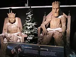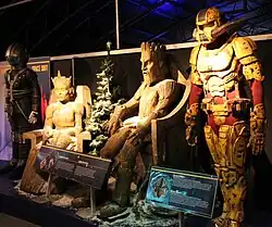 Several costumes and creatures in the episode, the spacesuit from the start of the episode, the Wooden Queen and King, and the Harvest Ranger costumes, on display at the Doctor Who Experience.