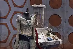 The Doctor refers to altering the control room's appearance as changing the desktop theme, as the Fifth Doctor does in "Time Crash".[2] Like the Third Doctor in Inferno (1970), the Doctor and Idris operate a TARDIS console without an outer TARDIS shell.[3] The Doctor also jettisons TARDIS rooms to create thrust, as he had done previously in stories such as Logopolis (1981) and Castrovalva (1982).[4] The Doctor admits he killed all of the Time Lords, alluding to the events of the Time War.[2] In The War Games (1969), the Second Doctor contacted the Time Lords using a cube similar to those seen in this episode.[5] The Doctor refers to himself as "a madman with a box", reprising Amy's and his own description of himself in "The Eleventh Hour".[3] The Doctor refers to Nephew as "another Ood I failed to save"; in "The Satan Pit" the Doctor commented that he did not have time to save the Ood.[2] Idris' cryptic words, "the only water in the forest is the river", are explained in the mid-series finale, "A Good Man Goes to War".[6]