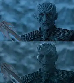 In order to create the Night King, according to Barrie Gower, it is primarily practical prosthetic, but also incorporates some VFX to create a more icy look and feel, saying about the eyes, "The effects department alters the eyes in post-production. They give them that blue-glowy hue to them, which we can't really achieve with contact lenses." In regards to the overall prosthetic, "they've added this sort of icy layer over the top of him to create this — it's something incredibly difficult to achieve practically, prosthetics are cast in a translucent rubber, which can only give you so much of that icy quality, so visual effects help augment it a little bit further to give it more dimension." Prior to the sixth season, the Night King was portrayed by Richard Brake, with a head mold of Brake being created in order to accurately mold the prosthetic to his face.[15] In the sixth season he was portrayed by Vladimir Furdik.[16] The White Walker army was first shot in front of a green screen in Magheramorne quarry, and according to a piece in The Hollywood Reporter "A scan was taken from a drone and used as the basis for a CG model of the location, which was augmented with VFX and joined with volcanic hills that were photographed in Iceland."[13] Crowd replication was used to create the 1,000-man army, with special effects supervisor Joe Bauer saying "It's scans of those actors in the makeup and costumes, with variations we used to make a digital army that extends up onto the hills."[13] Bauer also noted that VFX were used to create the weather conditions in the scene, noting "It's wind, mist, fog and heavy atmosphere that you'd get in a marine layer. The dramatic value is to say something's wrong; it's a mystery what they are facing. The temperature drops, and our characters can see their breath. The weather obscures their vision."[13] Spain-based El Ranchito, one of several special effects companies used by Game of Thrones, was responsible for the White Walker army shots.[13]