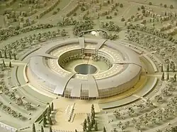 The Doughnut is surrounded by car and bicycle parking in concentric rings, guarded by a two-metre metal fence and half a dozen vehicle checkpoints.[3][6] The Doughnut is served by an underground road.[3]