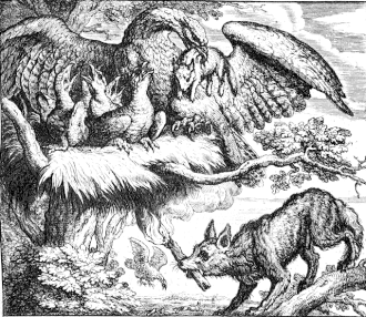 The fable's Latin version by Phaedrus is prefaced by the statement that the powerful should fear revenge from the humble that they harm. In his account, the mother fox pulls a flaming branch from an altar and threatens to burn down the tree in which the marauding eagle has nested. Fearing for the safety of its own young, the eagle restores the cubs.[2] This was the version taken up in early English collections of Aesop's fables, including those of William Caxton,[3] Francis Barlow,[4] and Samuel Croxall.[5] Marie de France also used this story in her 12th century Anglo-Norman account, with the additional detail that the fox had first bundled firewood around the tree. Her comment on the situation highlights the uselessness of appealing to those who use arbitrary force: "The proud rich man will never have mercy on the poor man because of his hue and cry, but if the poor man could wreak vengeance on him, then you would see the rich man bow."[6]