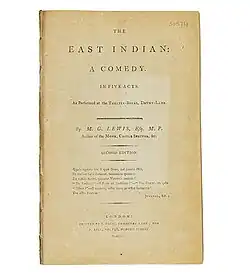 The East Indian is a 1799 comedy play by the British writer Matthew Lewis. It premiered at the Theatre Royal, Drury Lane on 22 April 1799. It was partly inspired by characters from Frances Burney's Cecilia[1] while the playbill advertised it as being inspired by the 1790 play Die Indianer in England by August von Kotzebue. The original Drury Lane cast included Robert Palmer as Lord Listless, William Barrymore as Modish, John Philip Kemble as Rivers, Charles Kemble as Beauchamp, James Aickin as Walsingham, Ralph Wewitzer as Friponeau, Thomas Hollingsworth as Squeez'em, John Bannister as Frank, Jane Powell as Mrs. Ormond, Dorothea Jordan as Zorayda and Charlotte Tidswell as Mrs. Blaball. Lewis had written the play several years earlier, and it was published in 1800 by John Bell.[2] [3]