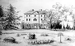 James Moilliet (1807-1878) was born in 1807 in Staffordshire. His father John Lewis Moilliet founded the bank J. L. Moilliet[11] and Sons which later merged with Lloyds Banking Group. He joined his father's banking firm and worked there until he gained his inheritance. He married twice. His first wife Lucy Harriot Galton by whom he had six children died in 1848 a year before he bought “The Elms”. He married Jeanne Susanne Sayous (1832-1901) who was Swiss in 1853 and had four more children. While he was living at the Elms he provided in 1850 the funding for the new St Mary's Church and his eldest daughter Miss Lucy Amelia Moilliet was asked to lay the foundation stone.[12] He made a sketch of “The Elms” in about 1850 which is shown.
