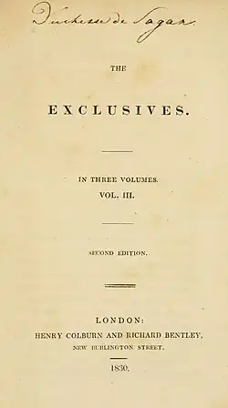 The Exclusives is an 1830 novel by the British writer Lady Charlotte Bury, originally published in three volumes. It is part of the then-popular genre of silver fork novels set in high society. It was also published in New York City by Harper the same year in two rather than three volumes. Although the daughter of a duke herself Bury, writing anonymously, used it as an expose of the manners and behaviour of the elite Ton.[1]