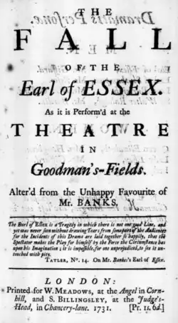 - Ralph, James (1731). The Fall of the Earl of Essex. As it is Perform’d at the Theatre in Goodman's-Fields. Alter’d from The Unhappy Favourite of Mr. Banks. London: Printed for W. Meadows, at the Angel in Cornhill; and S. Billingsley, at the Judge's-Head, in Chancery-Lane. Retrieved 13 August 2025.