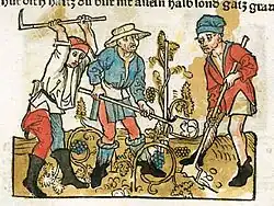 There is no consistency of titling. Greek sources make the father a farmer (Γεωργὸς), while Osius calls him a peasant (rusticus). Caxton's description is labourer, as is La Fontaine's, although the French laboureur has the meaning of an independent husbandman, the term used by Samuel Croxall. The nature of the ground cultivated differs as well. The 15th century illustrations in the Medici Manuscript[4] and in Heinrich Steinhowel's collection make it a vineyard, as it is also described in the poems by Faerno and Osius, but other versions are not always so specific.