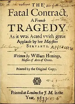 - ^ Otto Junge, The Fatal Contract: A French Tragedy, by William Hemings: Kritische Neuausgabe mit Einleitung und Anmerkungen, Löwen, 1912, pp. 64–66.