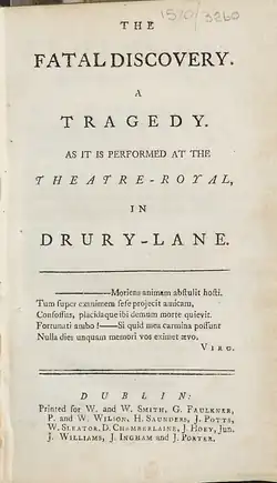The Fatal Discovery is a 1769 tragedy by the British writer John Home.[2] It premiered at the Theatre Royal, Drury Lane in London. The original cast included Spranger Barry as Ronan, Samuel Reddish as Orellan, Francis Aickin as Connan, John Palmer as Durstan, Thomas Jefferson as Kathul, James Aickin as Euran and Ann Street Barry as Rivine.[3]